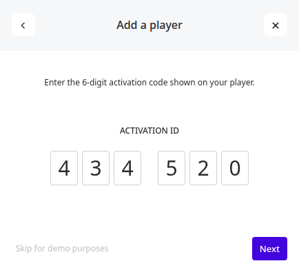 - Next, we enter the activation PIN code that is displayed on your Joan display. (You can "skip for demo purposes" that will create a virtual E-Ink Demo Player if you don't have a device yet, in such a case, please refer to this guide).