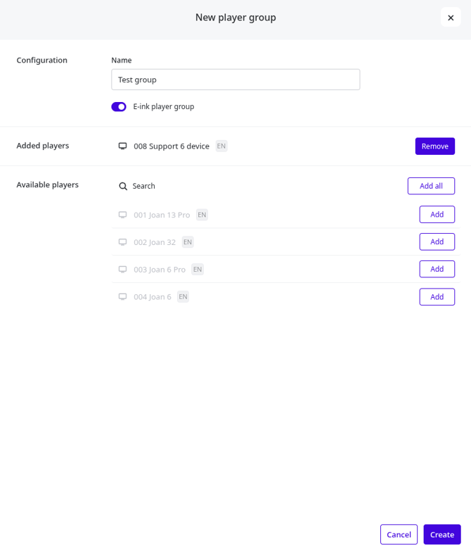 - Give a name to the Player Group, and we also need to select if it is an E-ink player group or not, which will give us a list of our devices accordingly