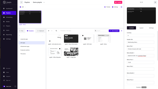 Joan Workplace Digital Signage is a comprehensive Content Management System (CMS) solution coupled with dedicated templates for workplace signage needs. It runs on Joan e-paper displays as well as regular LCD displays.
